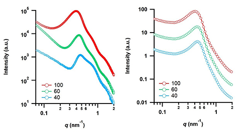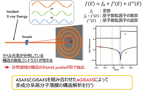特定元素の吸収端近傍のX線エネルギーで小角散乱測定を行うことで、特定元素の空間分布について議論ができます。吸収端近傍の少なくとも3つの波長(エネルギー)での小角散乱法によって得られる散乱データを解析することで達成されます。我々は、薄膜中でブロック共重合体がシリンダー状ドメインを形成する試料を用いて、第3成分である高分子をブレンドした際に、それがどの領域に分布するのかを評価しました。