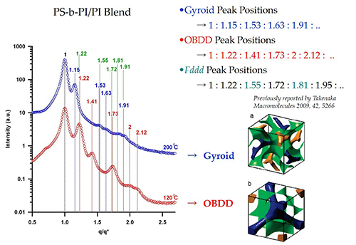 ブロック共重合体が形成するミクロ相分離構造は構成成分の体積分率に応じて球状、シリンダー状、ラメラ状ミクロ相分離構造を形成します。またシリンダーとラメラ状構造の境界では共連続構造(Bicontinuous)であるジャイロイド構造やFddd構造が見出されています。球状ミクロ相分離構造においては、ほとんどがBCC格子(体心立方格子)を組んだものになります。近年球状ミクロ相分離構造においてもFCC格子(面神立方格子)を組むことも見出され、新しいモルフォロジー探索にも注目が集まっています。共連続構造においてジャイロイド構造(Ordered Bicontinuous Double Gyroid : OBDG)に似た構造でダイヤモンド格子(Ordered Bicontinuous Double Diamond : OBDD)を組むものが発見されました。しかしブロック共重合体単独では理論的にも安定構造でなく、特殊な高分子であることが必要であります。ブロック共重合体にもう一成分の高分子を混ぜることで、出現するモルフォロジーに幅が広がります。我々は、そのようなブレンド系において、ダイヤモンド構造が熱力学的に安定構造として、発現することを見出しました。