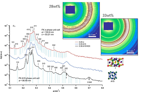 また、球状ドメインを形成する系において、このブレンド系において球状ドメインの複雑なパッキング様式となる、σ結晶、A15相、12回対称準結晶であるDDQCなど発見しています。