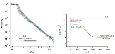 ハイドロゲル(含水したゲル)表面近傍の水の分布状態を中性子反射率測定により評価しました。実験は、茨城県の大強度陽子加速器施設(J-PRAC)、物質・生命科学実験施設(MLF)のBL16のSOFIAという装置で測定しています。ゲル表面をプラズマで処理した試料としていない試料において表面近傍での水の含水量が異なることを突き止めています。 左の図は、中性子反射率のデータ(白抜きのシンボル)であり、実験データを再現するように、右図の処理表面からの水の分布を仮定することで実験データをうまく再現しています(左の図の実線)。