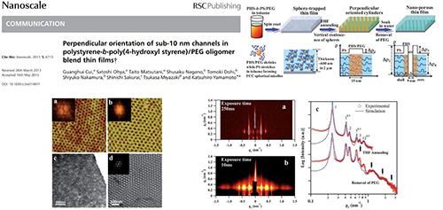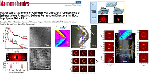 厚い膜(膜厚1㎜程度)においてもシリンダードメインを配向させることに成功しています。熱力学的非平衡構造である球状ドメイン(本来はシリンダー構造を好む)を作成しておき、その後、適切な溶媒の蒸気雰囲気にさらすことで、蒸気浸透方向にシリンダードメインが並ぶことを利用しています。